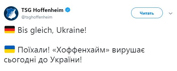 Чуть позднее появилось сообщение: "Поехали! "Хоффенхайм" отправляется сегодня в Украину!"