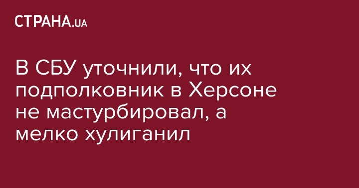 Подполковник СБУ, которого в центре Херсона задержали 15 сентября, действительно совершал мелкое хулиганство, однако, по информации пресс-секретаря ведомства, не мастурбировал. Об этом со ссылкой на пресс-секретаря СБУ Елену Гитлянскую сообщает УНИАН.