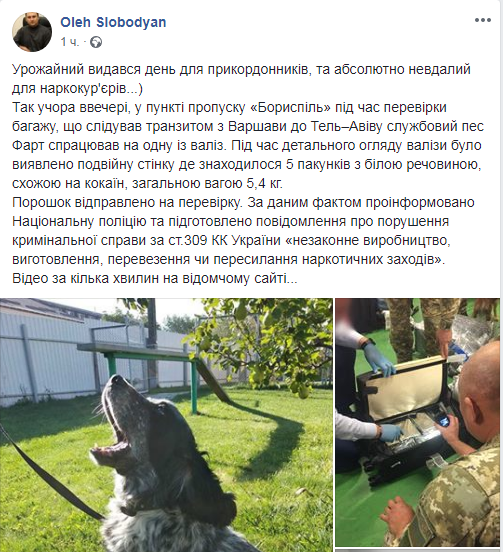 По словам Олега Слободяна, наркотики обнаружила служебная собака по кличке Фарт. При этом 5,4 кг кокаина были спрятаны в чемодане, который с другим багажом следовал через аэропорт "Борисполь" транзитом из Варшавы в Тель-Авив. Несмотря на то, что наркотики были спрятаны за двойной стенкой сумки, служебный пес Фарт обнаружил контрабанду.