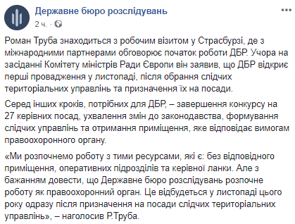 Директор Государственного бюро расследований (ГБР) Роман Труба во время заседания Комитета министров Совета Европы заявил, что ГБР откроет первые производства в ноябре - после избрания начальников следственных территориальных управлений и назначения их на должности. Об этом сообщила пресс-служба Бюро на своей странице в соцсети.