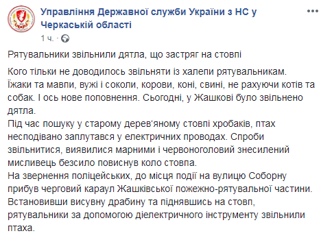 В городе Жашков Черкасской области спасатели освободили дятла, запутавшегося в проводах электрического столба. Об этом сообщили помощник начальника главного управления ГСЧС в Черкасской области Константин Проценко и пресс-служба ведомства.