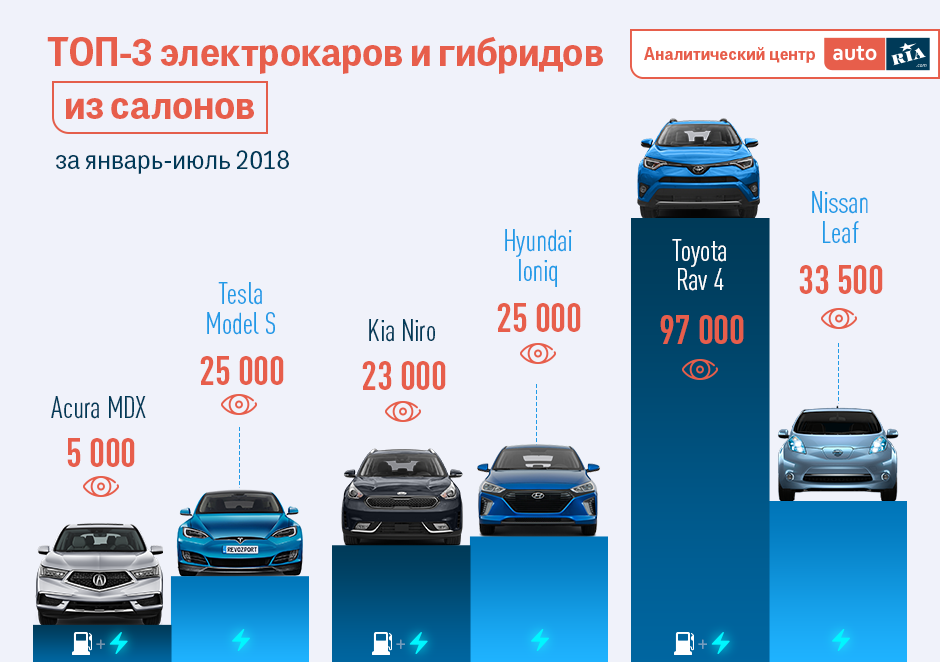 Тройку лидеров в сводном топе популярности электрокаров и гибридов открывает Hyundai Ioniq. С начала года украинцы пересмотрели предложения о продаже этой модели 25 тыс. раз. Хорошо знакомый Nissan Leaf может похвастаться ощутимо лучшими показателями - 33,5 тысячи просмотров. Лидирует же гибрид Toyota Rav 4. За семь месяцев украинцы просматривали автомобиль 97 тыс. раз. Что же касается творения Илона Маска Tesla Model S, то эта модель занимает лишь третье место исключительно среди электрокаров.