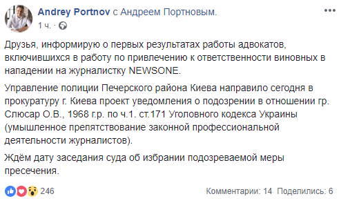 Сегодня, 19 сентября, управление полиции Печерского района Киева направило в столичную прокуратуру проект уведомления о подозрении в отношении гражданки Слюсар О, которая избила журналистку телеканала NewsOne Дарину Билеру по ч.1. ст.171 Уголовного кодекса Украины (умышленное препятствование законной профессиональной деятельности журналистов).