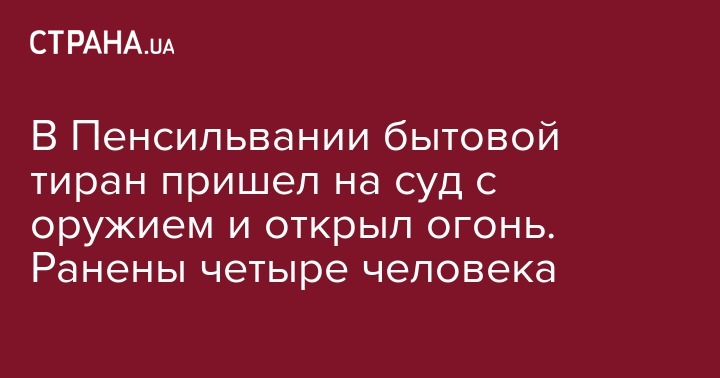 В США произошла очередная трагедия связаная со стрельбой. В среду, 19 сентября, в городе Мэйсонтаун (штат Пенсильвания - Прим.Ред.) подозреваемый в бытовом насилии, вошел в здание суда и открыл беспорядочный огонь по людям. Были ранены четверо человек, в том числе и полицейский. Охране пршлось открыть огонь на поражение и нападавший был убит.