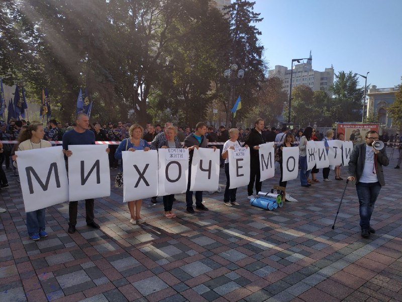 Митингующие держат в руках плакаты "Ми хочемо жити", а также зажгли фаеры и дымовые шашки. Площадь Конституции затянуло красным дымом.