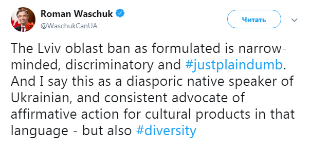 Посол Канады в Украине Роман Ващук высказался против запрета публично использовать русскоязычный культурный продукт на территории Львовской области. Об этом он написал в своем Twitter.