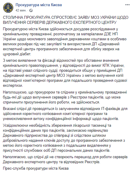В прокуратуре Киева опровергли заявление Минздрава об изъятии из Государственного экспертного центра серверов с данными пациентов. Такое заявлени опубликовано на странице ведомства в соцсети.