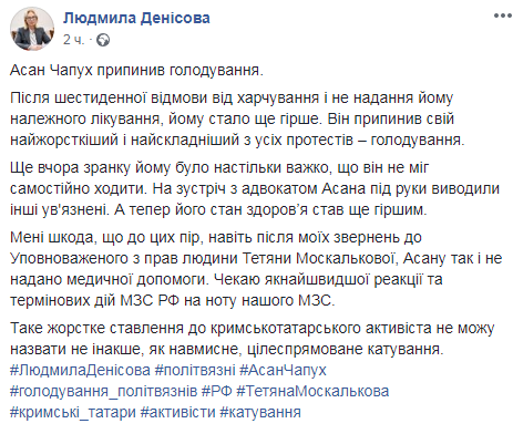 "После шестидневного отказа от питания и неоказания должного лечения, ему (Асану Чапуху, - Прим.Ред.) стало еще хуже. Он прекратил свой самый жесткий и самый сложный из всех протестов – голодовку", - отметила омбудсмен.