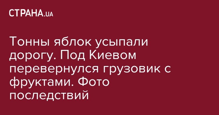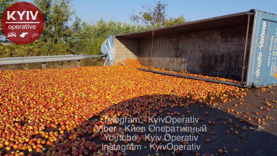Тонны яблок усыпали дорогу. Под Киевом перевернулся грузовик с фруктами. Фото последствий