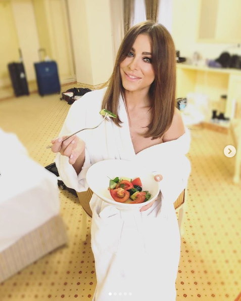 На снимке певица красуется в халате с оголенным плечом. В руках у нее тарелка с салатом.