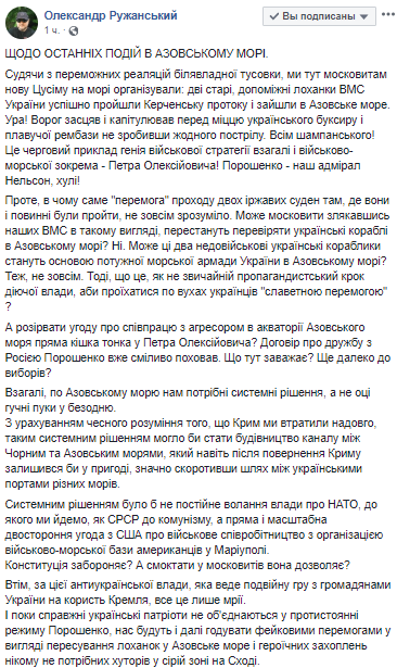 "Судя по победным реаляциям околовластной тусовки, мы здесь московитам новую Цусиму на море организовали: две старые, вспомогательные лоханки ВМС Украины успешно прошли Керченский пролив и зашли в Азовское море. Ура! Враг зассал и капитулировал перед мощью украинского буксира и плавучей Рембазы не совершив ни одного выстрела.