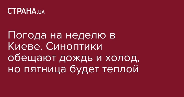 На этой неделе синоптики обещают в Киеве три-четыре дождливых дня и снижение температуры до +11...+16 днем. Ночью термометры покажут +3...+11. Самым теплым днем недели станет  пятница, когда воздух прогреется до +20. При этом одни погодные ресурсы обещают в этот день солнечную погоду, другие пишут, что будет срываться дождь.