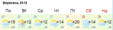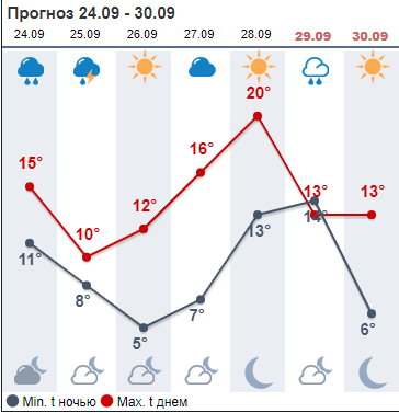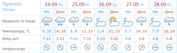 Ресурс Мeteoprog.ua обещает три дня осадков на неделе: 24, 25 и 29 сентября. Дневная температура +10...+16. Самым теплым и солнечным днем недели станет пятница.: до +20. Ночью +5...+14.