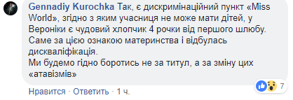 "Да, есть дискриминационный пункт "Miss World", согласно которому участник не может иметь детей, у Вероники есть замечательный мальчик, четыре годика, от первого брака. Именно по этому признаку материнства и состоялась дисквалификация. Мы будем достойно бороться не за титул, а за смену этих "атавизмов".