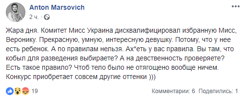 "Сегодня узнала, что девушку, которая выиграла Мисс Украина лишили короны через 4 дня после конкурса. Ну, думаю, может нашли, что эскортница.. может танцует стриптиз. Толкает наркоту? Нет, оказывается, у 23-летней девушки есть ребенок 4х лет. А мы понимаем, что это уже испорченный продукт, старая говядина. И тут же оргкомитет Мисс Украина лишил ее титула.