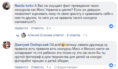 Кто-то посчитал возмутительным сам факт проведения подобных конкурсов. "А вас не смущает факт проведения таких конкурсов как "Мисс Украина" в целом? Если уж девушки позволяют оценивать кому-то свою красоту и сравнивать себя с кем-то другим, то чего уж на правила такого конкурса жаловаться?)".
