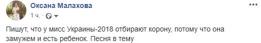 "Пишут, что у Мисс Украины-2018 отбирают корону, потому что она замужем и есть ребенок. Песня в тему".