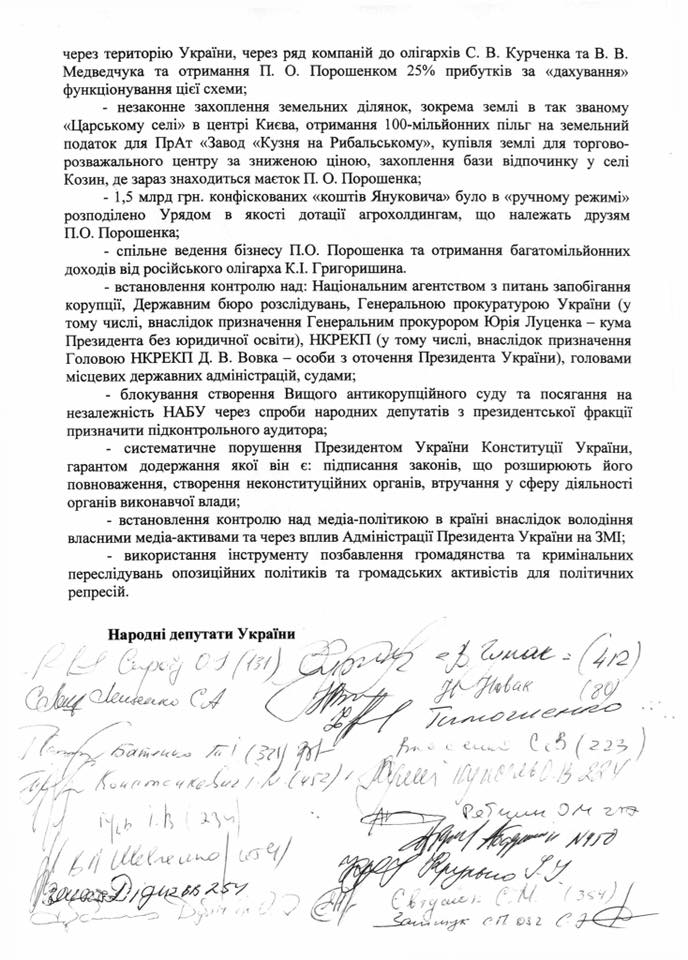 Нардеп также опубликовал копии письма и подписей. Члены парламента просят главу государства выйти на пресс-конференцию либо организовать открытую встречу с народными депутатами. Они призывают Петра Порошенко лично подтвердить или опровергнуть информацию о наличии у Порошенко незадекларированного имущества, корпоративных прав и средств в офшорных юрисдикциях и уклонении от налогообложения в Украине.