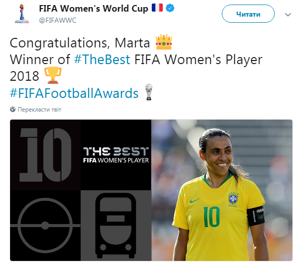В английском Лондоне на церемонии The Best FIFA Football Awards 2018 лучшей футболисткой мира признана игрок сборной Бразилии - Марта. Она играет за клуб "Орландо Прайд" в Национальной женской футбольной лиге США.