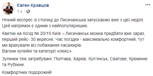 В воскресенье, 30 сентября, из Киева в Лисичанск впервые осуществит рейс ночной экспресс. Такой же, как запустили между Одессой и Львовом. Об этом сообщил исполняющий обязанности главы правления ПАО "Укрзализныця" Евгений Кравцов на своей странице в Facebook.