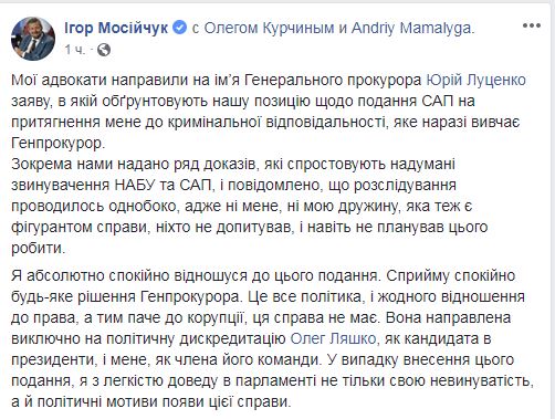 Адвокаты нардепа от Радикальной партии Игоря Мосийчука направили на имя генерального прокурора Юрий Луценко заявление, в котором указали позицию нардепа относительно представления САП на привлечение его к уголовной ответственности. Об этом Мосийчук сообщил в Facebook.