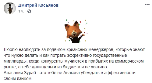 Так, политтехнолог Дмитрий Касьянов пишет о некомпетентности Зураба Аласании: "Люблю наблюдать за подвигом кризисных менеджеров, которые знают, что нужно делать и как потратить эффективно государственные миллиарды, когда конкуренты мучаются в прибылях на коммерческом рынке, а тебе дали деньги из бюджета и не хватило.