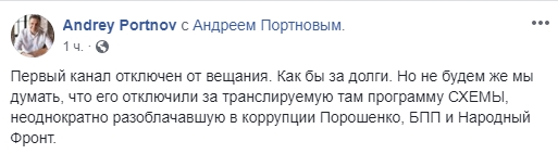 "Первый канал отключен от вещания. Как бы за долги. Но не будем же мы думать, что его отключили за транслируемую там программу СХЕМЫ, неоднократно разоблачавшую в коррупции Порошенко, БПП и Народный Фронт", - считает адвокат и медиаменеджер Андрей Портнов.