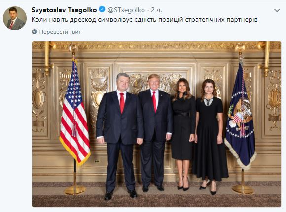 На организованный президентом США Дональдом Трампом в Нью-Йорке обед для партнеров в рамках 73-й сессии Генеральной ассамблеи ООН Трамп и президент Петр Порошенко пришли в одинаковых костюмах и галстуках. Фото двух президентов с первыми леди Украины и США обнародовал в Twitter пресс-секретарь Порошенко Святослав Цеголко.