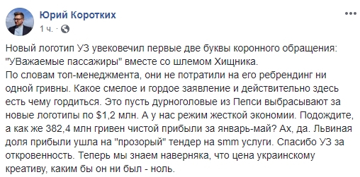 По словам топ-менеджмента, они не потратили на его ребрендинг ни одной гривны. Какое смелое и гордое заявление и действительно здесь есть чему гордиться. Это пусть дурноголовые из Пепси выбрасывают за новые логотипы по $1,2 млн. А у нас режим жесткой экономии. Подождите, а как же 382,4 млн гривен чистой прибыли за январь-май? Ах, да. Львиная доля прибыли ушла на "прозорый" тендер на smm услуги. Спасибо УЗ за откровенность. Теперь мы знаем наверняка, что цена украинскому креативу, каким бы он ни был – ноль".
