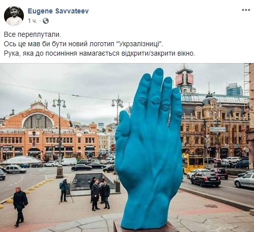 А журналист Евгений Саватеев вспомнил еще одну достопримечательность дня: "Все перепутали. Вот это должен был быть логотип "Укрзализныци". Рука, которая до посинения пытается открыть/закрыть окно".