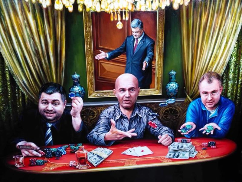 На торги выставлена картина под названием "Три глотки, не считая собаки", в центре которой за покерным столом изображены люди, похожие на известных украинских олигархов и политиков - Александр Грановский, Игорь Кононенко и Олег Гладковский (Свинарчук), которые считаются приближенными к главе государства.