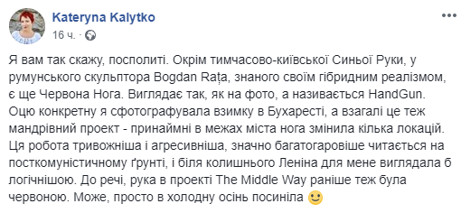 Пользователи отмечают, что у Богдана Раты, кроме синей руки, есть красная нога, установленная в Бухаресте. Она называется HandGun, ее перемещают в разные части города. поскольку арт-объект - часть передвижного проекта - Moving Monuments".