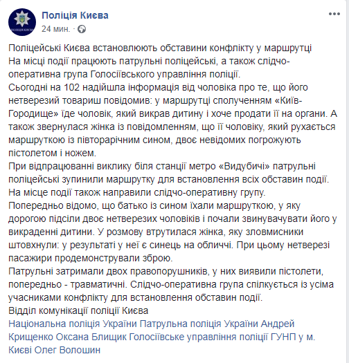 Ранее в СМИ появилась информация, что данную маршрутку прямо во время движения захватили мужчины с пистолетами и ножами. Однако, по информации правоохранителей, дело обстояло по-другому. Сначала по телефону "102" позвонил мужчина и сообщил, что его пьяный друг полагает, что в маршрутке "Киев - Городище" едет мужчина, который украл ребенка и хочет продать его на органы. После этого в полицию позвонила женщина и пожаловалась, что двое неизвестных угрожают ее мужу, который едет в маршрутке с полуторагодовалым ребенком, ножами и пистолетами.