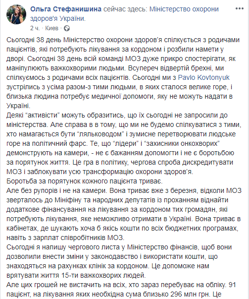 Минздрав Украины общается с родственниками пациентов, которым необходимо лечение за границей. Однако на эти встречи не приглашают активистов, которые живут в палатках у здания министерства. Об этом замминистра здравоохранения Ольги Стефанишина написала на своей странице в Facebook.