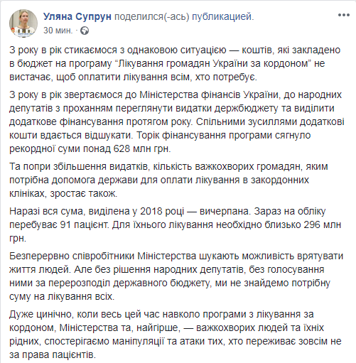 Как сообщила и.о. министра здравоохранения Ульяна Супрун, в прошлом году сумма финансирования программы "Лечение граждан Украины за границей" достигло 628 млн гривен. На сегодняшний день вся эта сумма иссякла. Денег не хватает на всех нуждающихся, и такая ситуация повторяется из года в год.