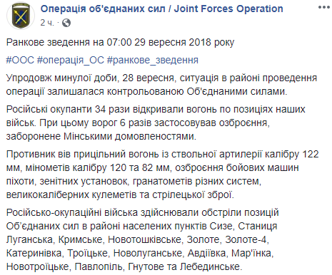 Также за минувшие сутки боевики 34 раза открывали огонь по позициям ВСУ, применяя вооружение, запрещенное Минскими договоренностями.