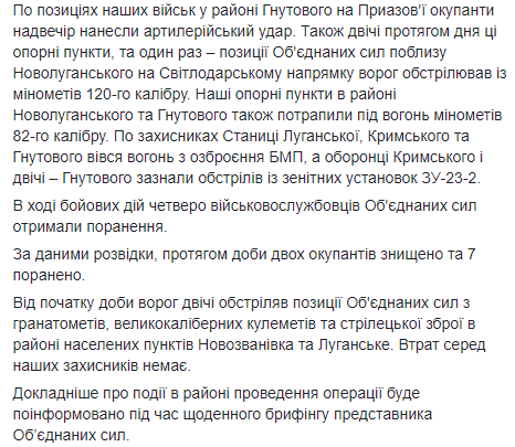Российско-оккупационные войска осуществляли обстрелы позиций Объединенных сил в районе населенных пунктов Сизое, Станица Луганская, Крымское, Новотошковское, Золотое, Золотое-4, Екатериновка, Троицкое, Новолуганское, Авдеевка, Марьинка, Новотроицкое, Павлополь, Гнутово и Лебединский.