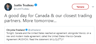 Премьер-министр Канады Джастин Трюдо в своем микроблоге в Twitter назвал заключение нового торгового соглашения хорошим днем для Канады и ее торговых партнеров.