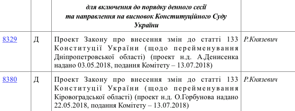 Законопроекты, предусматривающие переименование областей,были зарегистрированы еще в апреле 2018 года. Группа из более чем 150 народных депутатов предложила украинцам изменить один из основных пунктов Конституции – административно-территориальное деление страны. Переименовать Днепропетровскую область в Сичеславскую, а Кировоградскую – в Кропивницкую.