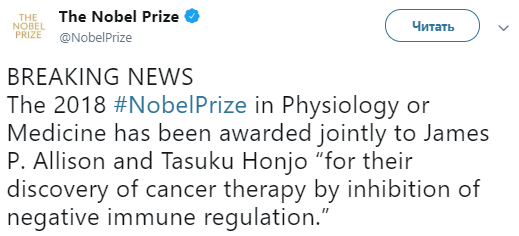 Сегодня, 1 октября, в Стокгольме объявили имена обладателей Нобелевской премии по медицине и физиологии. Премия присуждена Джеймсу Эллисону и Тасуку Хондзё за исследования в области терапии рака. Об этом сообщается в Twitter.