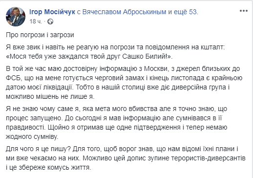 Также Мосийчук пишет, что не знает, почему покушение готовится именно на него, однако хочет "чтобы враг знал, что ему известны его планы, и он уже ждет его".