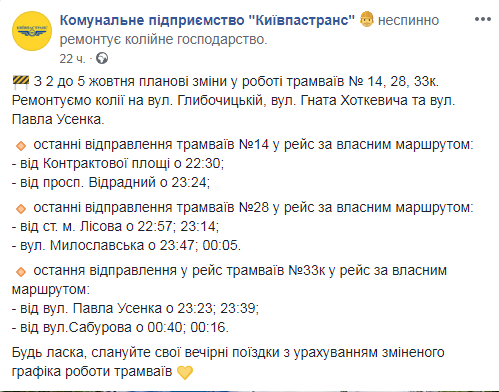 Кроме того, меняют режим работы некоторые трамвайные маршруты. Об этом на странице в Facebook сообщает КП "Киевпастранс".