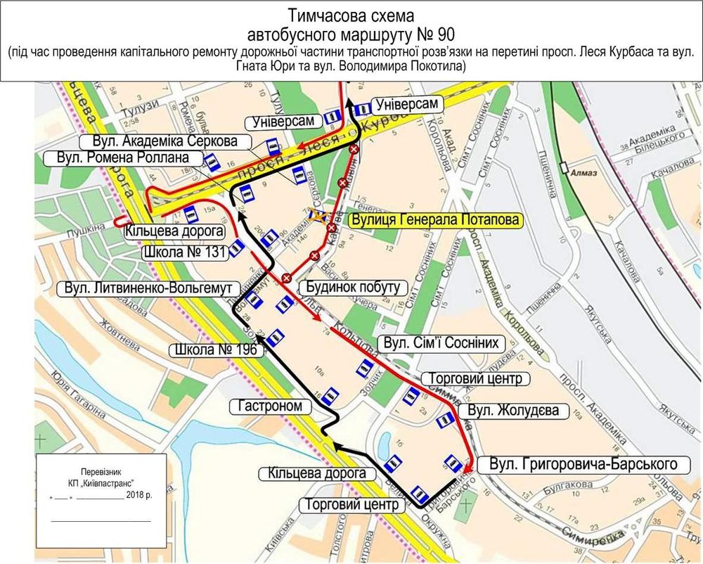 Что касается автобуса №90, его маршрут будет таким: от площади Валерия Марченко в направлении улицы Григоровича-Барского к проспекту Леся Курбаса по собственному маршруту, далее улица Леся Курбаса - бульвар Кольцова, дальше по собственному маршруту.