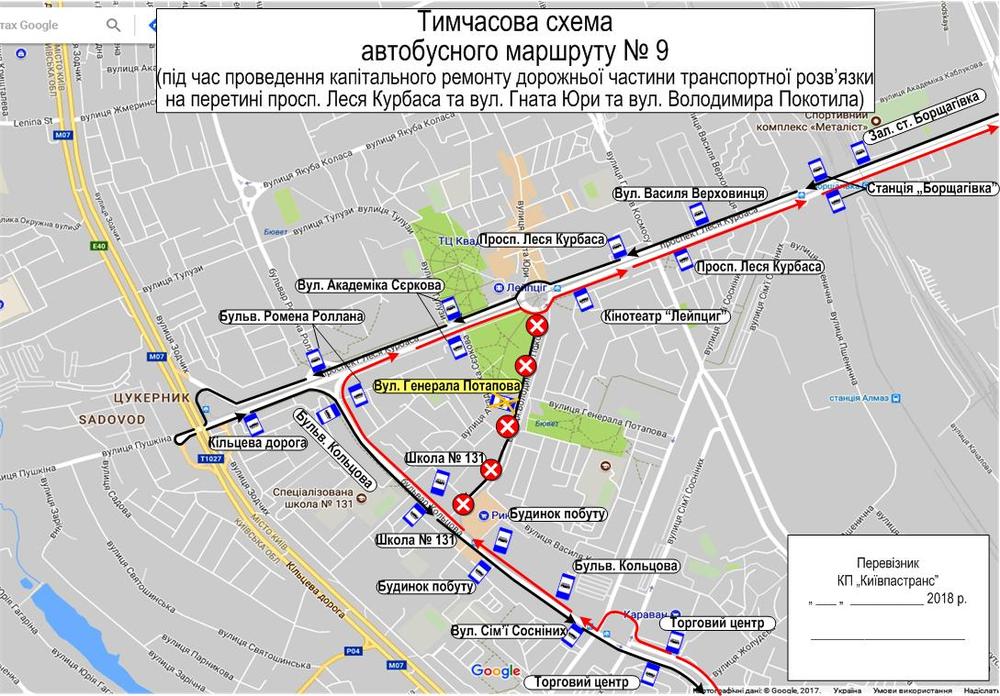 В частности, автобус №9 будет ходить в направлении улицы Булгакова от станции метро "Лукьяновская" до улицы Леся Курбаса по собственному маршруту, далее - бульвар Кольцова - улица Симиренко, дальше по собственному маршруту.