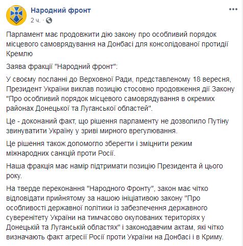 Фракция Верховной Рады "Народный фронт" выступила за продление парламентом действия закона "Об особом порядке местного самоуправления на Донбассе" для "консолидированного противодействия Кремлю". Об этом сказано в заявлении фракции в Facebook.