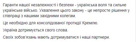 "По твердому убеждению "Народного Фронта", закон должен четко соответствовать принятому по нашей инициативе закона "Об особенностях государственной политики по обеспечению государственного суверенитета Украины на временно оккупированных территориях в Донецкой и Луганской областях" и законодательным актам, которые четко определяют факт агрессии России против Украины на Донбассе и в Крыму", - говорится в сообщении.