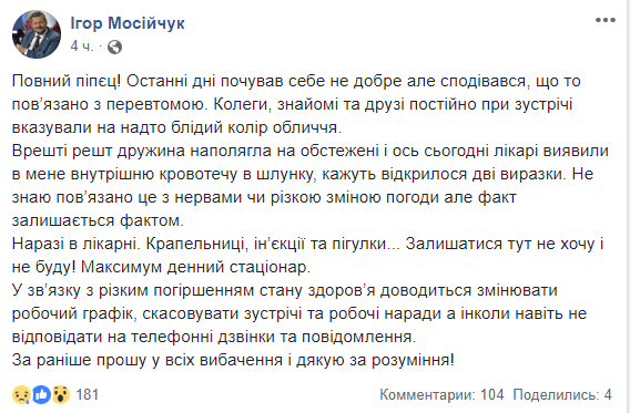 "Сегодня врачи обнаружили у меня внутреннее кровотечение в желудке, говорят, открылись две язвы. Сейчас в больнице. Капельницы, инъекции и таблетки. Оставаться в больнице не хочу и не буду" Максимум дневной стационар. Из-за ухудшения здоровья вынужден менять рабочий график", - говорится в его сообщении.