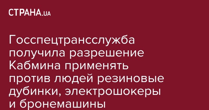 Кабинет Министров разрешил сотрудникам Государственной специальной службы транспорта применять в отношении правонарушителей резиновые дубинки, электрошокеры и бронемашины без штатного вооружения. Такое решение правительство приняло на заседании 3 октября, передают Украинские новости.