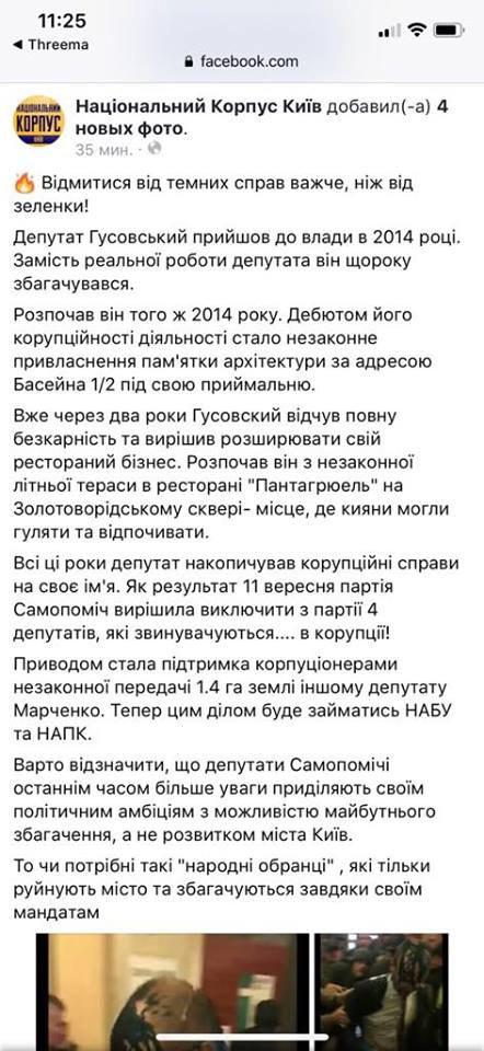 На странице Нацкорпуса в Facebook вскоре после нападения появилась информация о Гусовском, которого здесь обвиняют в коррупции и присвоении памятников архитектуры по адресу Бассейная 1/2, здание которого чиновник, как заявляют националисты, забрал под офис.