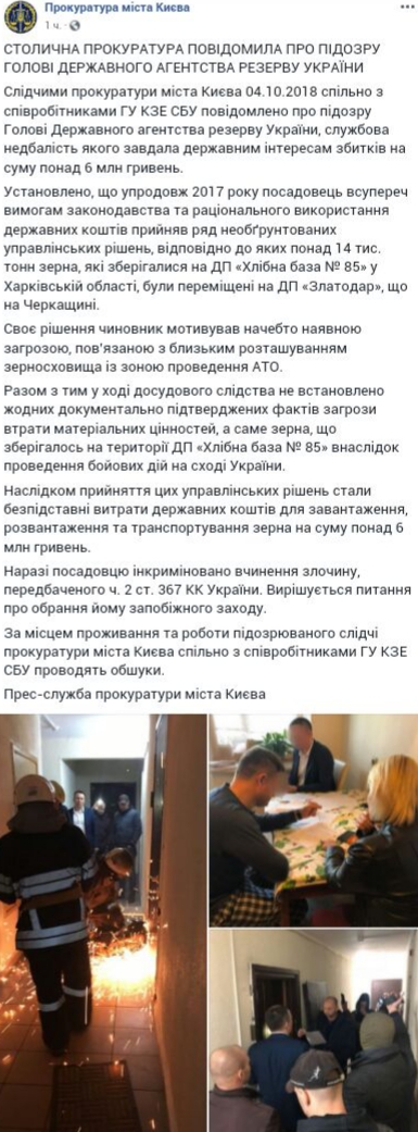 "Более 14 тонн зерна, которые хранились на "Хлебной базе 85" в Харьковской области были переведены в Черкасскую область на "Златодар". Свое решение чиновник мотивировал тем, что существует угроза, связанная с близким расположением зоны проведения АТО. Вместе с тем, досудебное расследование не подтвердило таких фактов угрозы" - пресс-служба прокуратуры Киева.